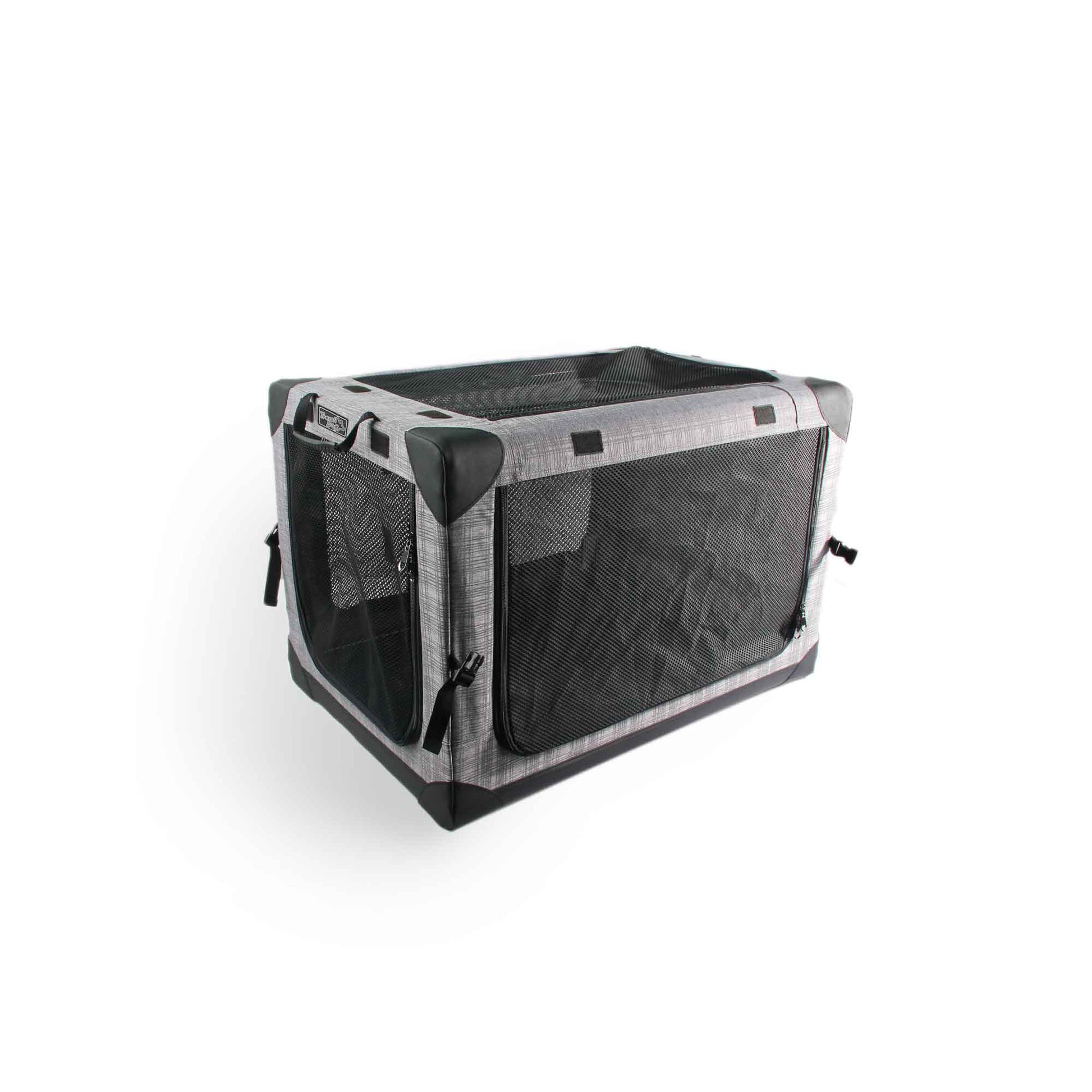 Light weight and easy to assemble portable soft pet crate, that folds and buckles for easy storage and features handles for your convenience.